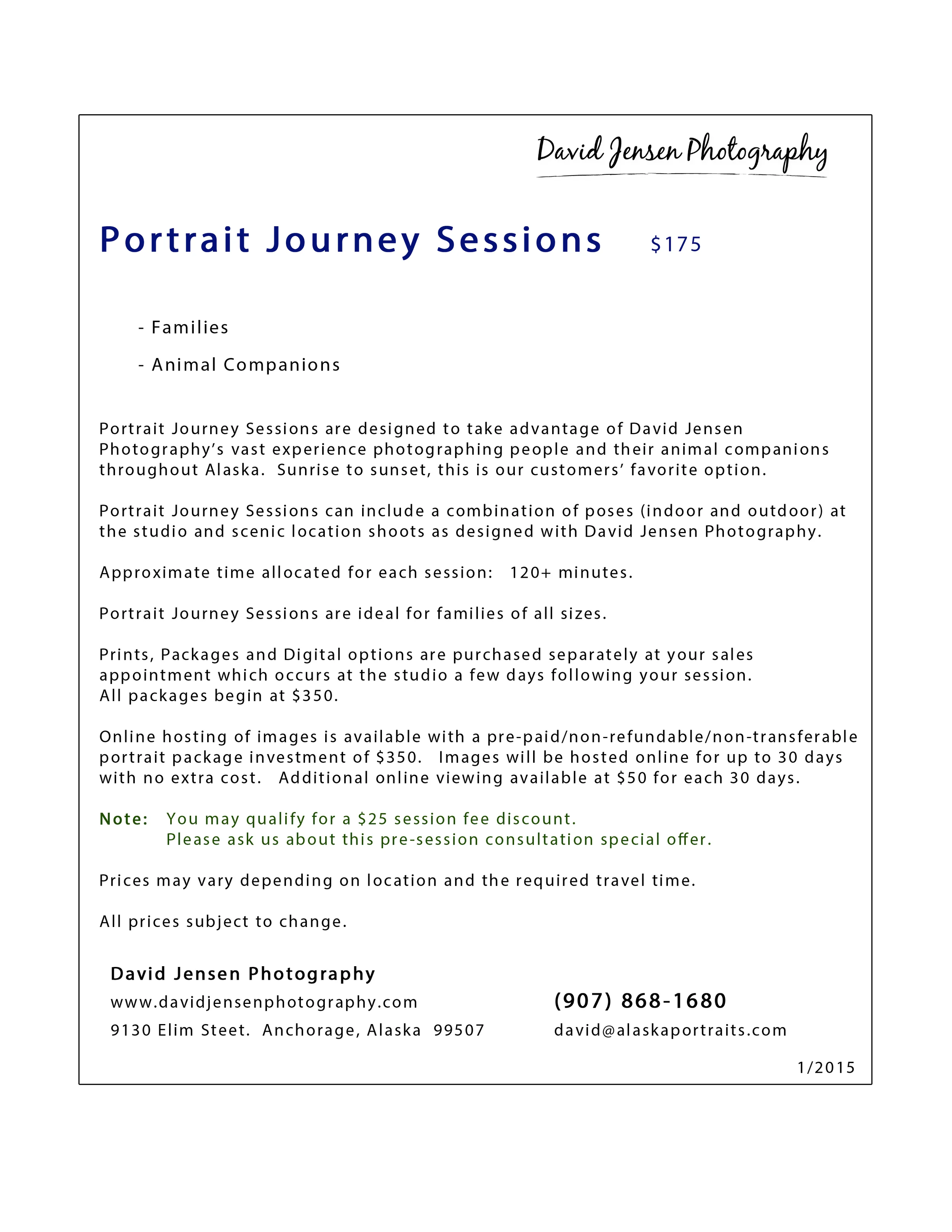 Portrait Journey Session prices may vary depending on travel time to more remote locations.